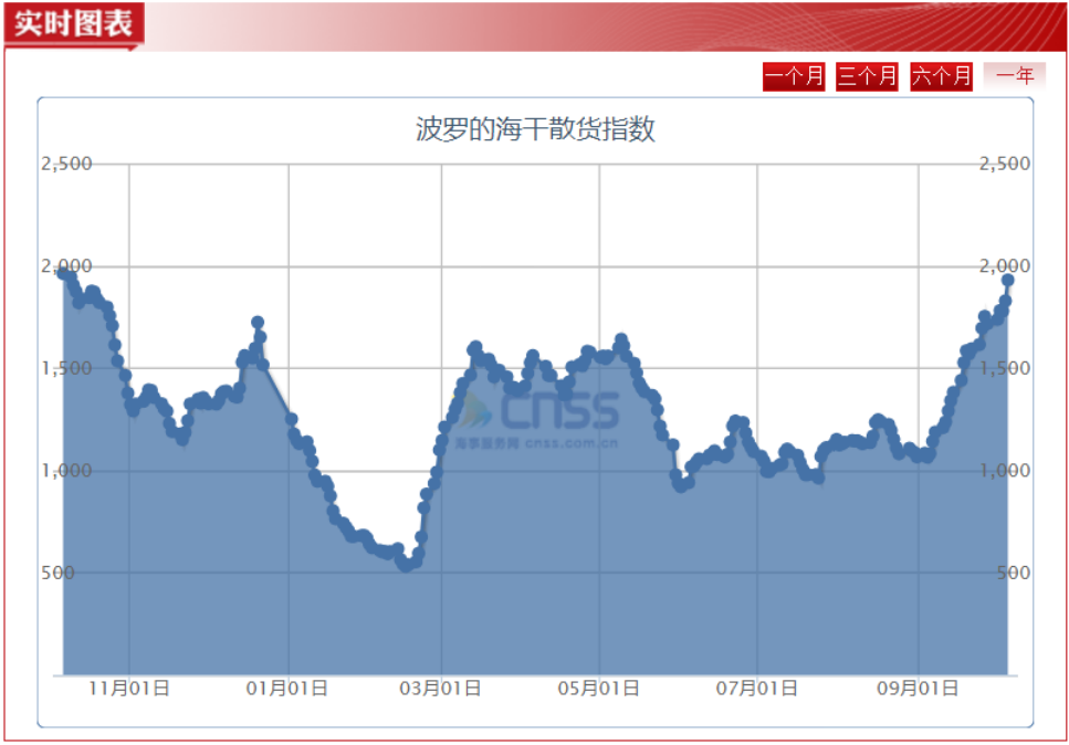 散裝船運市場海岬型現貨市場日租運從9月5日的8266美元開始上漲,昨天已漲至27445美元,創15個月新高,一個月來漲幅高達232%,今日單日上漲2718美元,漲幅高達11%。