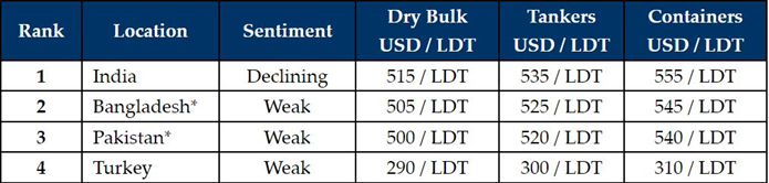 最后,土耳其市場仍處于疲軟狀態(tài),基本面仍籠罩著負面情緒。在板材價格(進口和當地鋼材)下跌的背景下,土耳其的拆船價格也下跌了約10美元/輕噸,干散貨船的價格跌至300美元/輕噸以下。