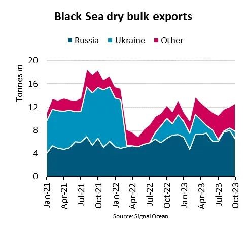 今年1-10月,受俄羅斯小麥出口推動,黑海干散貨出口量較2022年同期增長了13%。在俄羅斯連續兩次小麥豐收后,今年該國谷物出口有望創下新紀錄。但由于俄烏沖突導致烏克蘭貨量減少,黑海干散貨出口量仍較2021年下降了20%。