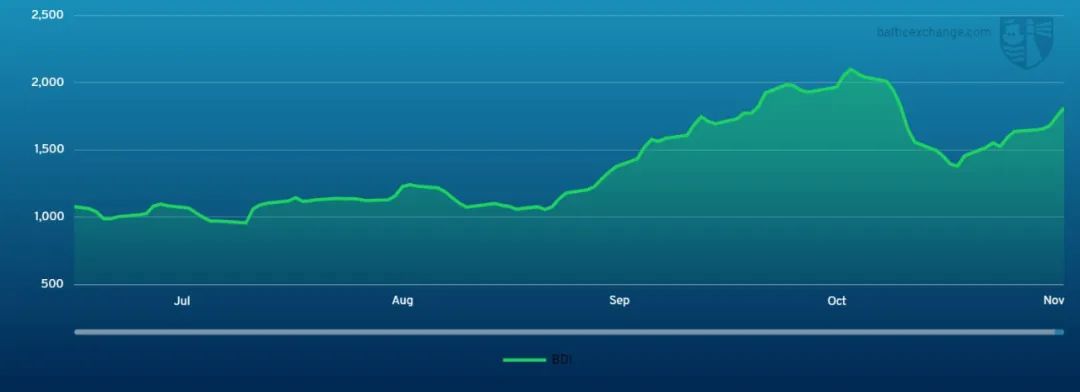 如上,BDI指數從9月以來出現一波漲勢曾一度達到2105點,隨后出現下跌。然后進入11月后,BDI指數近期整體出現連續的攀升,昨天(11月19日)BDI指數再次大幅上漲62點至1820點,漲到7個多月來的高點,盡管如此,近期有多位知名船東公司的高層領導表示,在短期內干散貨市場預期將比較悲觀。