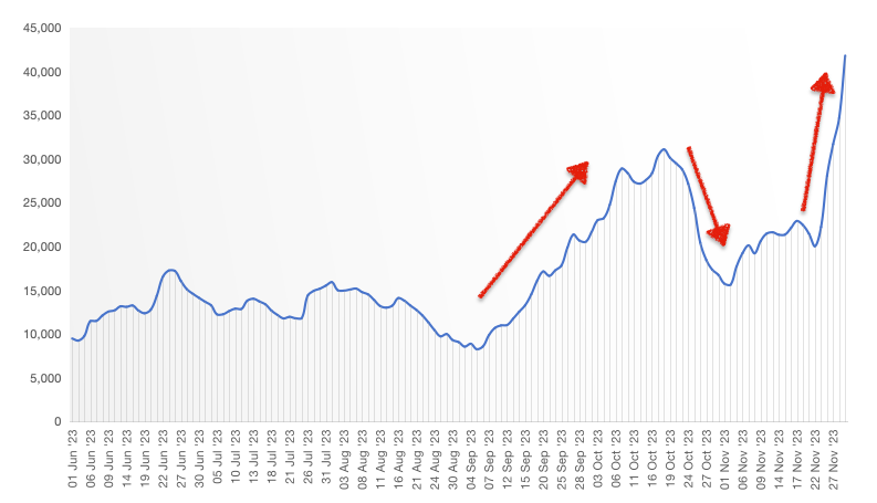 此后,市場有所回暖,海岬型航線 (5TC) 日平均租金在2萬美元左右震蕩。11月23日本輪行情開始發展,五個交易日迅速拉漲108.7%,海岬型航線 (5TC) 日平均租金在昨日突破4萬美元大關。