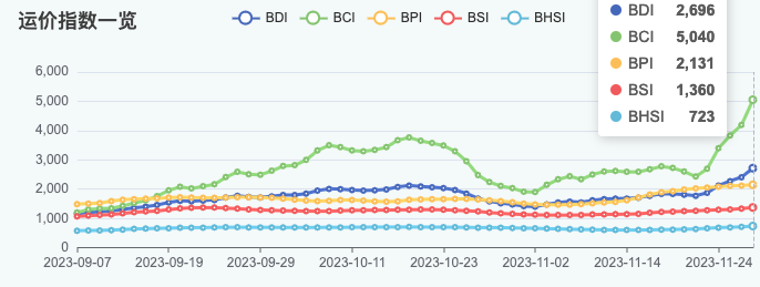 11月29日,波羅的海干散貨運價指數(BDI)上漲305點或12.8%,至2696點;波羅的海海岬型船運價指數(BCI)上漲861點或21%,至 5040點;波羅的海巴拿馬型船運價指數(BPI)上漲25點或2.6%,至2131點;波羅的海超靈便型船運價指數(BSI)上漲39點或3%,至1360點。