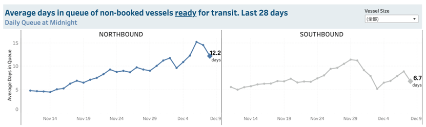 半數(shù)船舶的減少并不意味著擁堵的緩解,船舶平均排隊(duì)天數(shù)仍較半月前大幅增加。巴拿馬運(yùn)河管理局最新數(shù)據(jù)顯示,最近28天準(zhǔn)備過(guò)境未預(yù)訂船只的北行平均排隊(duì)天數(shù)達(dá)到12.2天,南行為6.7天,而11月22日北行平均排隊(duì)天數(shù)8.3天,幾天前這一數(shù)字甚至一度超過(guò)了15天。