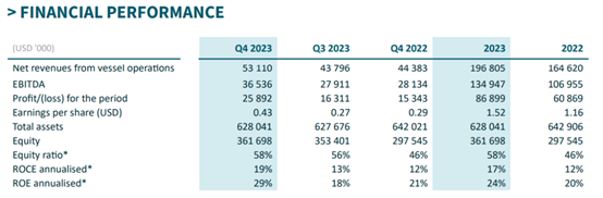 該航運公司的營業利潤(EBITDA)也從2022年第四季度的2810萬美元增加到2023年的3650萬美元。