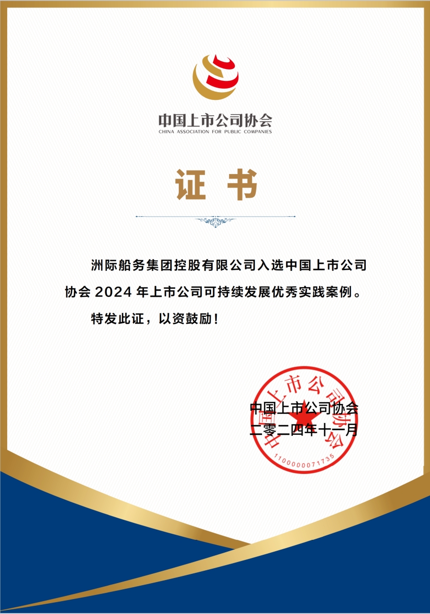 11月26日,洲際船務再獲殊榮,成功入選中國上市公司協會“2024年上市公司可持續發展優秀實踐案例”,成為行業內踐行可持續發展理念的標桿企業。這一榮譽進一步肯定了公司在ESG實踐中的創新探索和卓越成果。