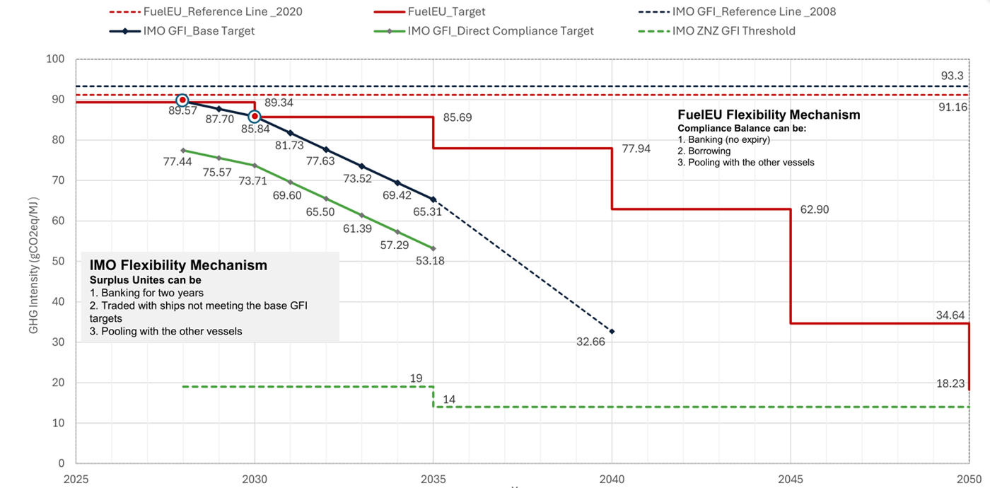 值得關注的是,國際海事組織(IMO)在今年 4月舉行的MEPC83會議上通過了溫室氣體減排中期機制 ——“淨零框架”(Net-Zero framework),該框架預計於 2028 年在全球範圍內生效。此框架推出了與 Fuel EU 基本邏輯相近的經濟機制,但細節上存在一些差異,其實行兩級合規機制,排放強度(GFI)設基礎合規目標(Base target,BT)和直接合規目標(Direct target,DT),GFI高於DT但低於BT,產生T1合規赤字,GFI高於BT,產生T2合規赤字,合規赤字可通過向IMO淨零基金購買補救單位(Remedial Unit, RU)來平衡,T1 赤字補救單位每噸100美元,T2 赤字補救單位每噸380美元。與 Fuel EU 相似,IMO淨零框架允許船舶針對T2 赤字,以其他船舶的盈餘(SU)來平衡,以實現集體合規,與FuelEU合規池理念是一致的。因此,無論是針對先行實施的 FuelEU,還是未來的IMO淨零框架,合規池都是一種長期的高價值合規選擇,必將助力企業在全球航運脫碳競賽中搶佔先機,構建可持續的競爭優勢。
