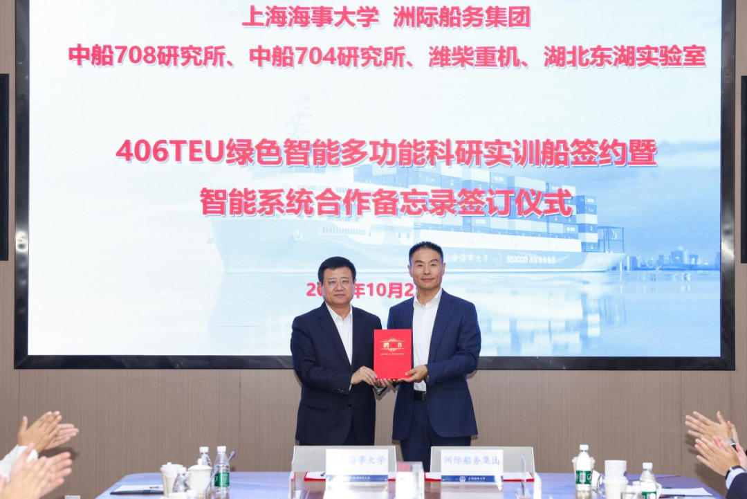 10月25日,洲際船務與上海海事大學在臨港校區簽署“綠色智能多功能科研實訓船”(簡稱“科研實訓船”)協議,並聯合多家單位簽訂科研實訓船智能系統合作備忘錄。上海海事大學校黨委書記宋寶儒、洲際船務集團董事長郭金魁、中國船舶集團第七〇八研究所總工程師黃蔚、中國船舶集團第七〇四研究所產業發展部主任朱曉清、東湖實驗室綠色交通創新中心副主任鄧芳、濰柴集團總經理助理尹曉青等嘉賓出席,簽約儀式由上海海事大學校黨委副書記兼副校長李志鵬主持。