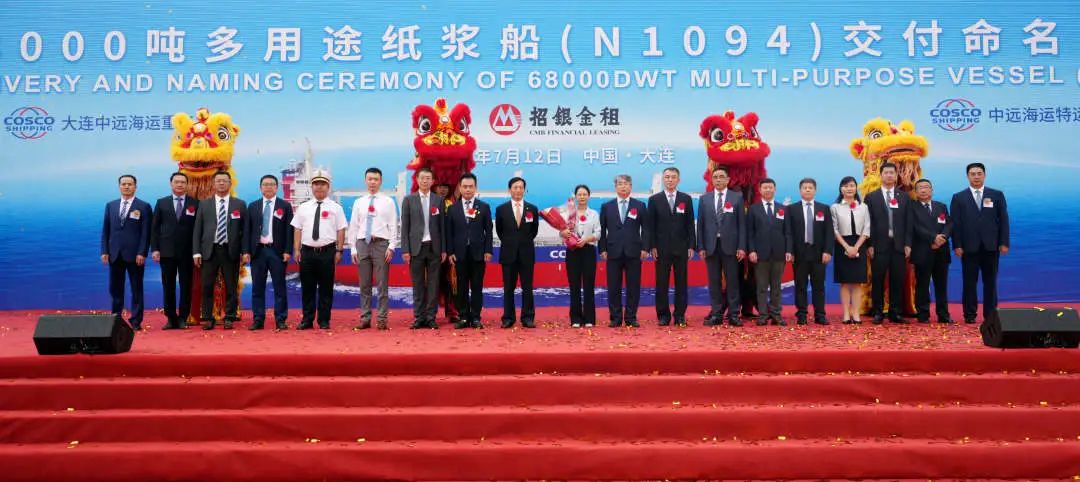 7月12日,全球最大的冰級多用途紙漿船68000噸“GREEN KEMI”輪在大連交付中遠海運特運運營。招銀金租、招商銀行大連分行、洲際船務集團、中國船級社大連分社、上海船舶研究設計院、中遠海運特運、中遠海運重工等相關單位的領導和嘉賓出席了交船儀式。許麗華女士為新船命名。