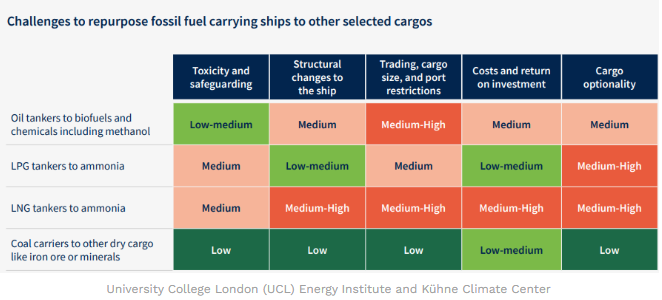 將船舶重新用於運輸替代貨物面臨著挑戰,特別是對於LNG運輸船這種專用船舶而言。從技術角度來看,LPG運輸船運輸氨的可能性相對較大;一些原油油輪可能會找到生物燃料或化學品進行運輸。然而,關於新能源產品的市場和運輸需求,以及改裝運輸化石燃料的船舶的經濟可行性,仍存在許多不確定性。