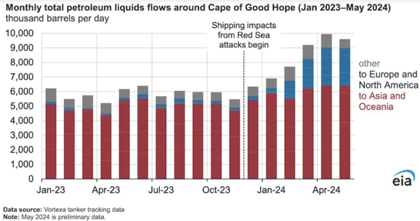 美國能源資訊署的資料顯示,2024年前五個月,繞過好望角的原本平均每天590萬桶的原油和成品油運輸量,已飆升至870萬桶,漲幅高達47%。