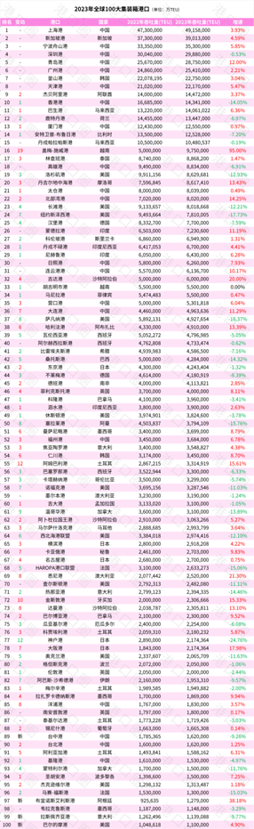 2023年全球100大集裝箱港口排名出爐,中國占20席