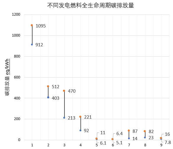 注:1.粉煤,無碳捕獲與儲存2.天然氣聯合循環電廠發電技術,無碳捕集與儲存3.粉煤,有碳捕獲與儲存4.天然氣聯合循環電廠發電技術,有碳捕集與儲存5.660MW水力發電6.核能發電7.聚光太陽能發電8.多晶硅光伏發電9.陸上風力發電