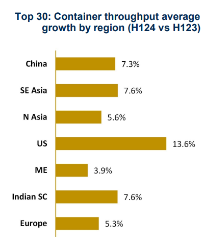 除了上述港口外,截至目前,前30名港口中所有已公佈第二季度數據的港口在整個上半年均實現了吞吐量增長,增幅從2.4%(鹿特丹港)到20.0%(北部灣港)不等,平均增幅為7.0%。