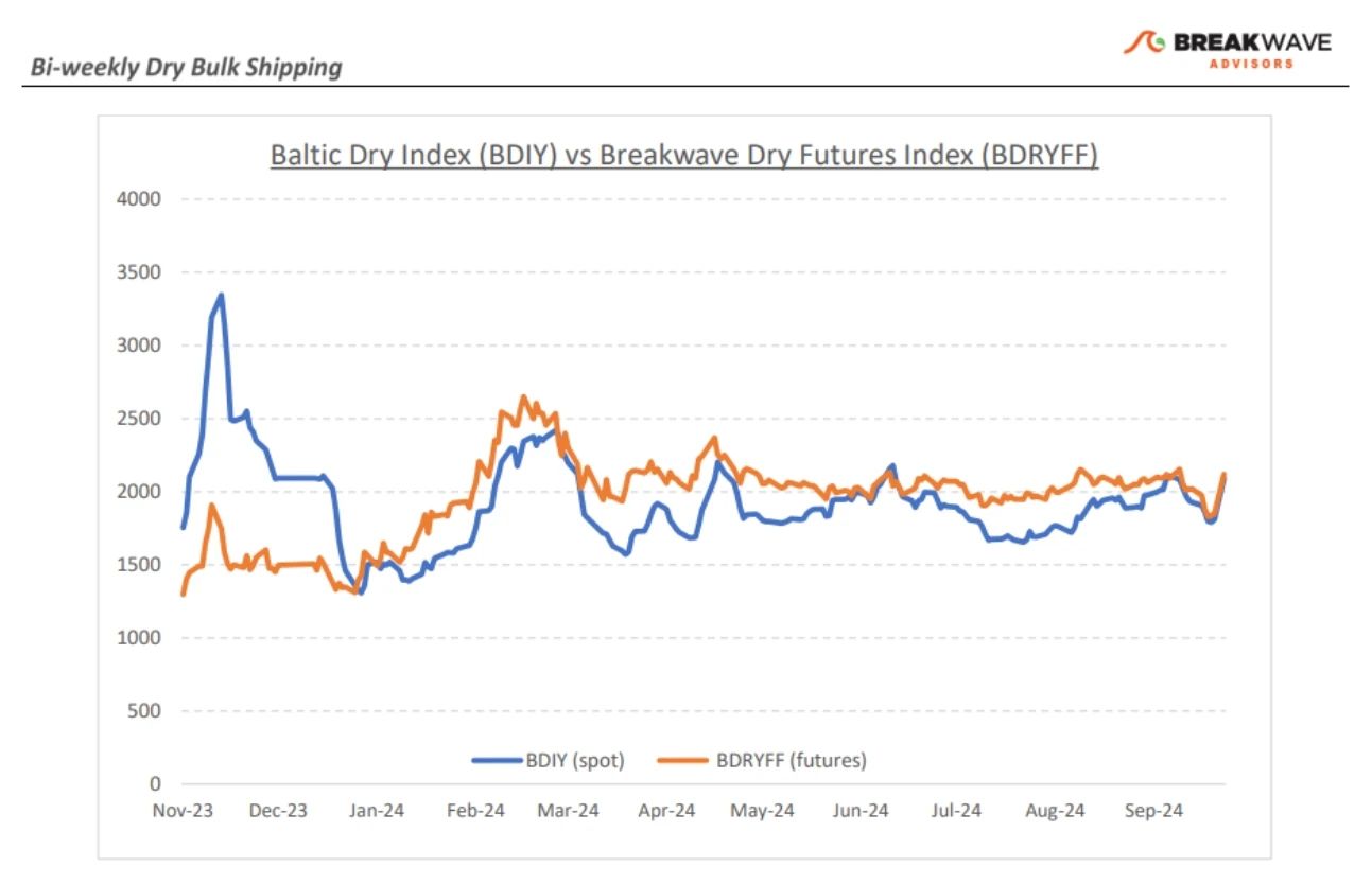 幹散貨 ETF 交易平臺Breakwave Advisors在最新週報中表示,中國近期一連串的刺激政策宣佈後,鐵礦石市場再度掀起波瀾,期貨價格的大幅波動反映了市場的高度投機性。作為大宗商品的鐵礦石,其價格波動更多由資金流動驅動,儘管從長期來看,基本面因素至關重要,但短期內的價格走勢幾乎完全由每日新聞主導。