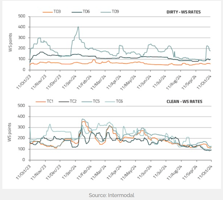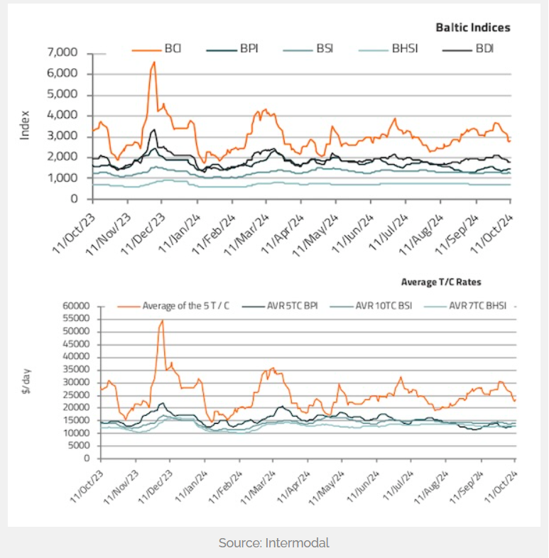 Intermodal指出,巴西玉米出口量正在減少,特別是在第二茬玉米(safrinha)收穫期間。繼去年巴西超越美國成為世界最大玉米出口國之後,巴西的糧食總出口量(包括大豆在內(nèi))同比開始減少。ANEC數(shù)據(jù)顯示,2024年1月至9月,巴西玉米出口量為2349萬噸,而去年同期為3408萬噸。預計10月出口量將繼續(xù)下滑至568萬噸,而去年同期達802萬噸。巴西通常在safrinha收穫期間出口大部分玉米,今年也不例外,但6月至9月期間的出口量比2023年同期減少了25.59%。這一變化不僅影響了巴西的糧食出口總量,也對全球幹散貨航運市場產(chǎn)生了影響。