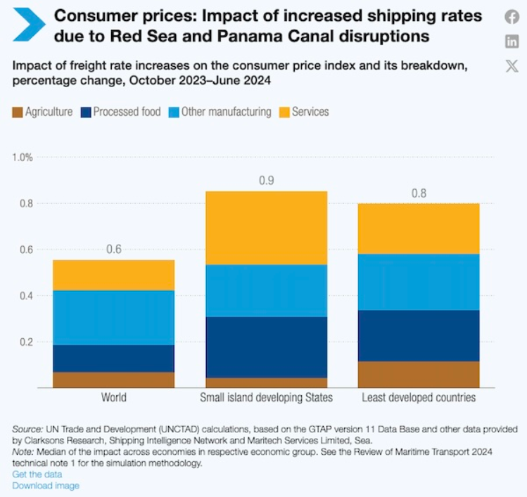 各國在應對干擾和成本上升方面的表現差異顯著,小島嶼發展中國家(SIDS)和最不發達國家(LDCs)受到的衝擊最為嚴重。分析顯示,若紅海與巴拿馬運河的干擾導致集裝箱運價上漲趨勢延續至2025年底,全球消費者價格或上漲0.6%,而SIDS的價格漲幅可能高達0.9%,加工食品價格更可能飆升1.3%。鑒於SIDS經濟高度依賴航運進口必需品,且過去十年海運連通性平均下降9%,其孤立狀態日益加劇,目前與全球航運網路的連通性平均低於非SIDS國家十倍。
