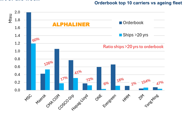 Alphaliner的集裝箱船分析師表示,目前全球十大集裝箱航運(yùn)公司仍在運(yùn)營著683艘船齡達(dá)到或超過20年的船舶,其總運(yùn)力超過260萬標(biāo)準(zhǔn)箱。若以遠(yuǎn)洋貨船的正常商業(yè)壽命為25年為基準(zhǔn),則這些數(shù)據(jù)表明,前十大運(yùn)營商或需動(dòng)用其綜合訂單的44%用於替換最老舊的船舶,而非用於船隊(duì)擴(kuò)張。