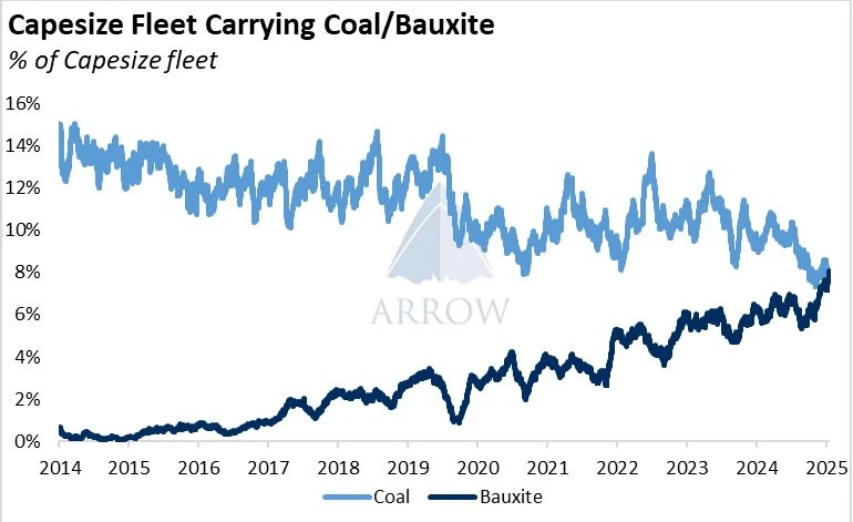 值得一提的是,根據航運經紀公司Arrow近日統計公佈的數據,好望角型Capesize型船隊首次運輸的鋁土礦量超過了煤炭。
