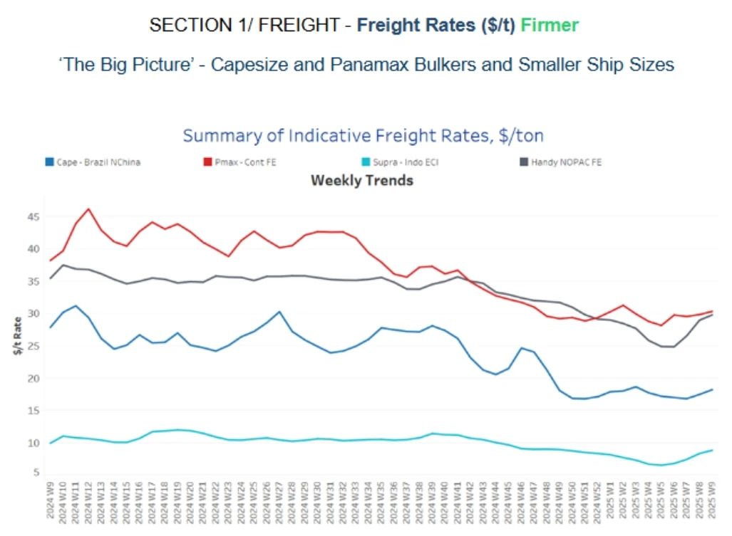 庫存的小幅下降似乎表明,中國當(dāng)前對進(jìn)口鐵礦石的即時需求正在通過其龐大的現(xiàn)有庫存得到滿足。吞吐量的增加與庫存的減少相結(jié)合,意味著當(dāng)前的庫存足以滿足進(jìn)口需求,而無需額外的新貨運(yùn)。這一現(xiàn)象反映出市場對庫存的依賴正在上升,可能削弱對新貨運(yùn)進(jìn)口的需求。