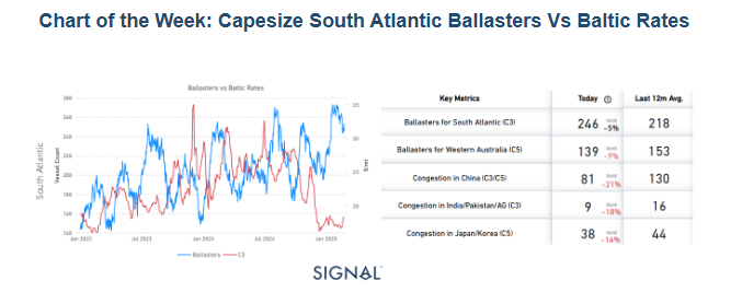“總體而言,穩(wěn)定的吞吐量、港口庫存的戰(zhàn)略性使用以及壓載船數(shù)量的增加,共同暗示市場正處於一個過渡階段。如果這些趨勢持續(xù),海岬型船日租金可能會繼續(xù)下跌,迫使航運(yùn)公司重新評估其運(yùn)力部署和定價策略,以應(yīng)對供應(yīng)逐漸超過新需求的市場環(huán)境。截至月底,南大西洋地區(qū)的壓載船數(shù)量較前期高點小幅下降5%,但仍遠(yuǎn)高於年初的歷史低點。目前尚不確定3月的趨勢是否會繼續(xù)下行,這可能為C3航線的運(yùn)費(fèi)提供一定支撐。”Signal總結(jié)道。