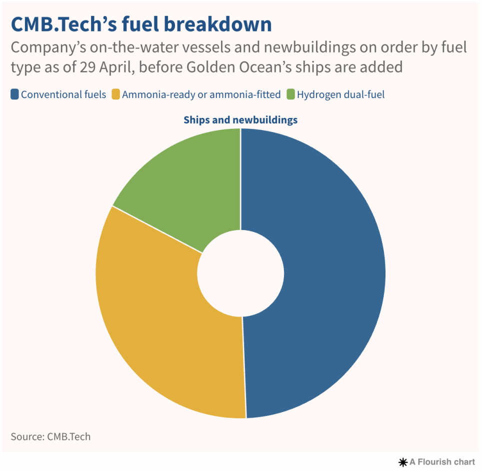作為比利時上市公司Compagnie Maritime Belge(CMB)的首席執行官,Saverys解釋稱,Golden Ocean的船隊具備現代化、高能效的特點,雖仍依賴傳統燃料,但其低碳屬性為CMB.Tech提供了規模化運營的基礎。“船隊擴張加速了我們與客戶關於新能源解決方案的對話,”他表示,“Golden Ocean的船舶年輕且高效,雖然目前燃燒柴油,但為我們更快推出氨動力新造船奠定了基礎。”