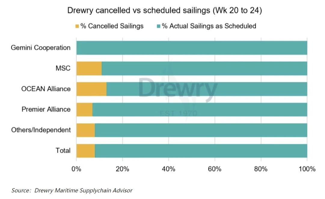 根據德路裏最新數據,從2025年5月12日到2025年6月15日,主要的東西向主航線——跨太平洋、跨大西洋以及亞洲-北歐和地中海航線——已經宣佈了58個航次取消,取消航次總數占計畫692個航次的8%,其中,約62%將在跨太平洋東向航線。
