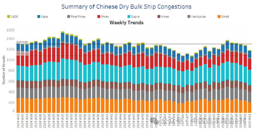 5月的第三周,中國幹散貨港口擁堵狀況繼續(xù)緩解,此前在4月份一直呈上升趨勢。