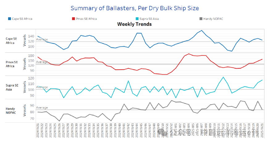 根據(jù)Ballaster指標,南非東南部的好望角型散貨船和巴拿馬型散貨船活動仍高於年度平均水準。