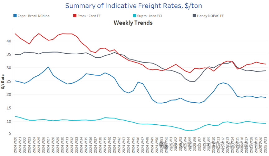 · 在東南亞,超靈便型散貨船幹散貨市場呈現(xiàn)出強勁上升趨勢,超過了第13周之前的峰值。