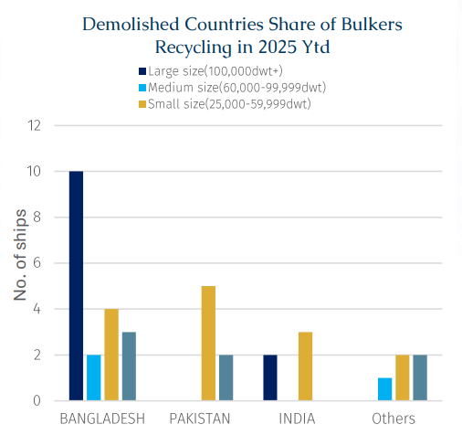 儘管面臨挑戰,孟加拉目前仍是全球最大幹散貨船拆解中心,截至2025年中,其承接的拆解量占全球總數的53%。BRS分析認為,這一優勢主要源於印度拆船廠正在大規模改造升級,以及印巴關係緊張令市場更傾向於選擇孟加拉。