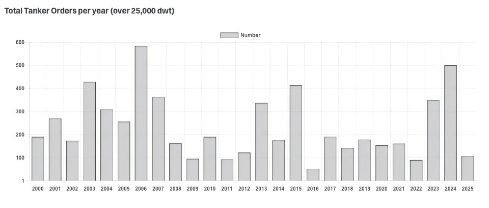 船舶經紀Gibson表示,“今年25000載重噸以上的油輪訂單劇減少,總訂單量約為110艘。這一下降反映了監管和市場的不確定性,以及新造船價格持續高企的影響。目前價格仍略低於去年創下的多年峰值,而船廠幾乎沒有提供大幅折扣的動力。2025年的訂單遠低於2023年和2024年近850艘,與2016年至2022年間訂單量大致相當。唯一一個相對強勁的細分市場是蘇伊士型油輪,今年已訂購36艘”。