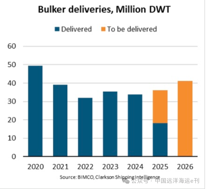 在2026年底前預計交付的5930萬載重噸中,巴拿馬型船占33.9%,超靈便型船占28.3%。這兩個船型在2023-2024年的訂單量激增,主要得益於相對較高的運價水準。