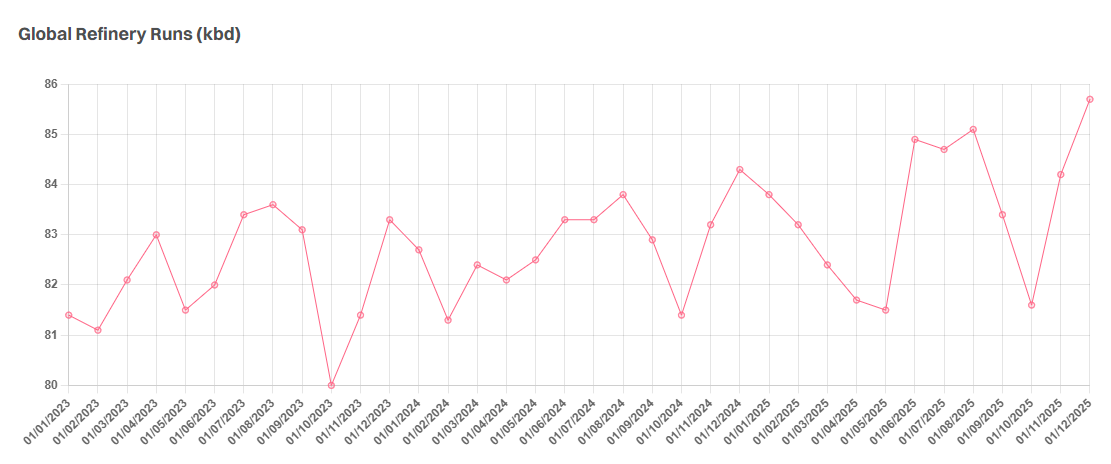 然而,根據Gibson的說法,“儘管存在這些挑戰,但預計明年全球煉油吞吐量仍將增長50萬桶/日。經合組織國家將出現50萬桶/日的下降,而非經合組織國家,主要是蘇伊士以東的國家,其產量將增長100萬桶/日,其中40%來自中東,部分得益於Sitra煉油廠的擴建。然而,除了基本面因素外,地緣政治的不確定性仍然很大。”