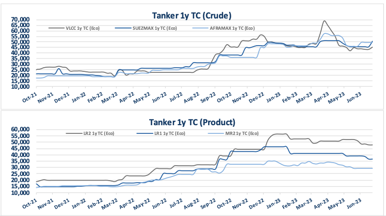 船舶經紀公司Xclusiv在最新週報中表示:“油輪方面,由於高額的二手船價格以及收益豐厚抑制了相應的買賣欲望,在過去三個月裏,二手船買賣活動似乎有所放緩。2023年第二季度共發生159筆交易,較第一季度下降30%。二手船買賣主力船型為MR2型,今年迄今共有114艘MR2型油輪易主,約占油輪總銷售量的30%。其次是小型油輪(>=10,000載重噸)、巴拿馬型/LR1型和阿芙拉型/LR2型,各占油輪總銷售量的15%左右。在蘇伊士型油輪和VLCC領域,購買欲望受到抑制,僅有24艘和34艘船被交易,占油輪總銷售量的6%和9%。與2022年同期相比,2023年前6個月的二手油輪買賣活動仍處於較高水準,增長了27%。”