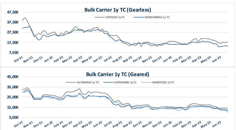 Xclusiv在報告中指出,與油輪二手船買賣活動趨勢類似,2023年第二季度的幹散貨船買賣活動也所減弱,下降約23%。截至6月27日,今年總共有311艘船被售出,其中135艘發生在二季度。上半年,超靈便型和靈便型船在二手船交易活動中占主導地位,共出現84艘超靈便型和78艘靈便型船交易,占散貨船總銷售量的27%和25%。其次是海岬型船,約占散貨船總銷量的13%,而Ultramax和巴拿馬型船在船東的偏好中略低,各占總銷量的10%。