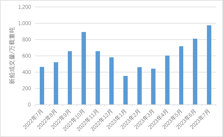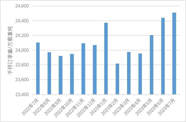 2023年7月,全球成交新船訂單100艘973萬載重噸,同比分別上升7.5%和109.2%,環(huán)比分別下降4.8%和上升20.3%。全球船舶完工交付96艘636萬載重噸,同比分別下降14.3%和上升2.3%。7月末,全球船舶手持訂單4121艘2.45億載重噸,同比分別下降7.0%和上漲1.7%。
