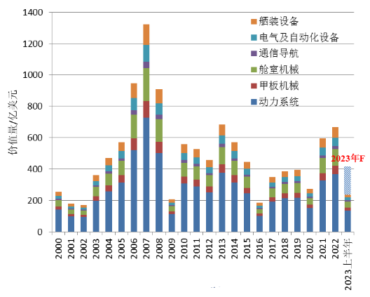 隨著我國造船業的快速發展,我國造船完工量、新接訂單量、手持訂單量等關鍵指標的國際市場份額均保持第一,給我國船舶配套市場帶來了很大需求。2023年上半年,全球船舶配套市場規模在240億美元左右,其中我國船舶配套市場占比超60%。