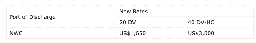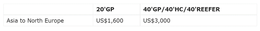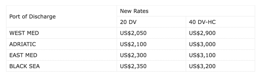 新FAK標(biāo)準(zhǔn)為:- 遠(yuǎn)東至阿什杜德,2300美元/TEU、3260美元/FEU- 遠(yuǎn)東至海法,2400美元/TEU、3420美元/FEU- 遠(yuǎn)東至土耳其,2400美元/TEU、3260美元/FEU- 遠(yuǎn)東至黑海,2600美元/TEU、3650美元/FEU