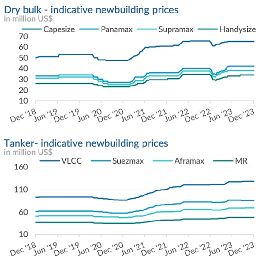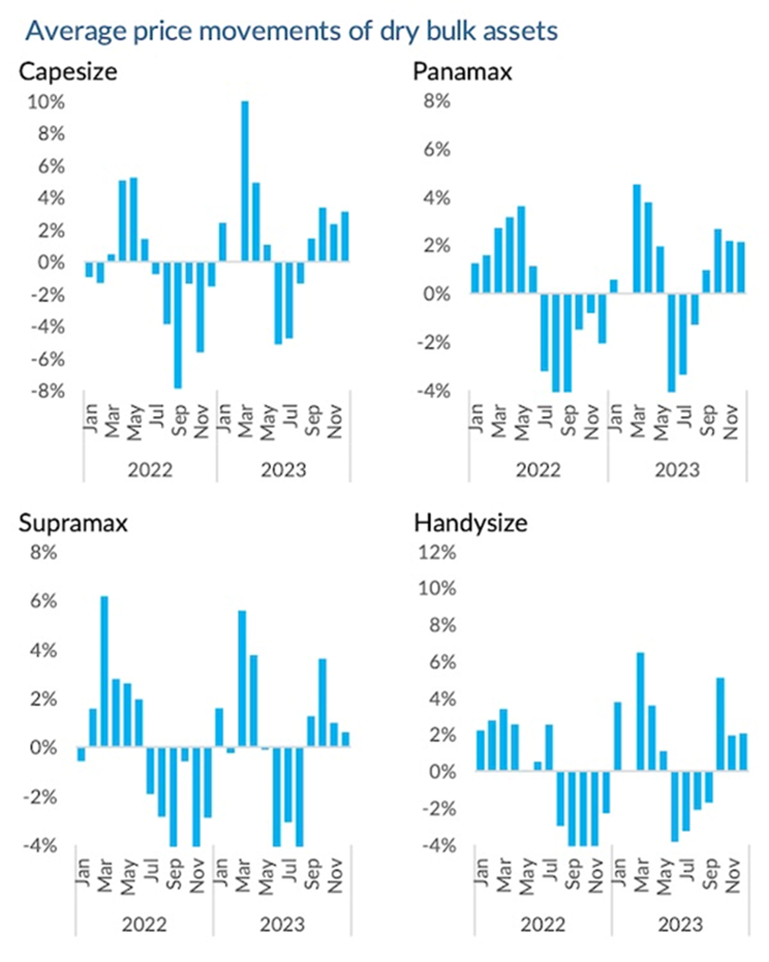 臨近年底,新船訂單基本都來自亞洲船東。船舶經紀公司Allied在其最新週報中表示,散貨船板塊,商船三井訂造了5艘紐卡斯爾型船。今年紐卡斯爾型船大受歡迎,在42艘好望角型及以上的幹散貨船訂單中占30艘左右。Eastern Pacific Shipping今年至今新增了10艘新船訂單,是今年散貨船新單最多的船東。油輪板塊,上周有2艘LR1型和2艘LR2型油輪簽約。與2022年相比,今年LR1型船大受歡迎,新增近20艘訂單,而去年卻沒有一筆交易。
