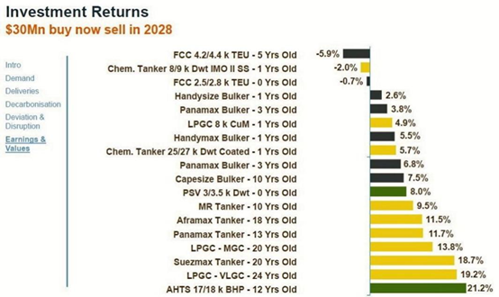該清單共列出了18種船舶,2028年初出售可獲得正向回報率的共15種,按照順序分別為: