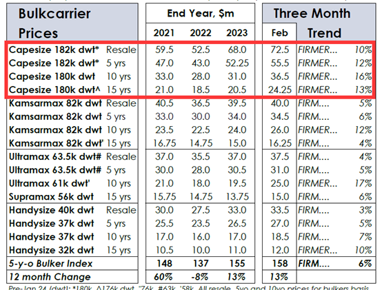克拉克森研究資料顯示,近三個月各種船齡的好望角型船舶的二手船價均有10%以上的上漲幅度。