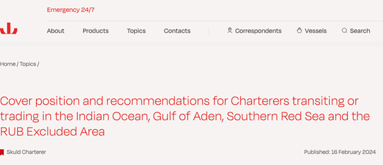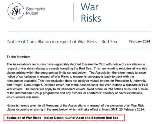 此外,挪威SKULD保賠協會和英國Steamship Mutual 保賠協會已向所有固定保費被保險人(包括租船人)發出《戰爭險取消通知》。