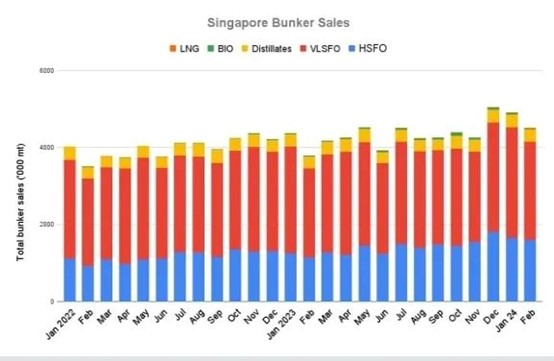 具體來說,與1月相比,今年2月的極低硫燃油(VLSFO)銷量環比下降10.7%至255萬噸,高硫燃油(HSFO)環比下降3.5%至160萬噸,餾分油環比下降5.8%至31.2萬噸,生物混合燃料環比下降65.6%至1.56萬噸。其中,生物混合燃料銷量是自2022年8月以來的最低水準。