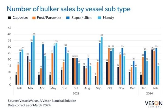 二手散貨船市場整體表現(xiàn)活躍,今年至今交易量同比增長約35%。2024年2月,好望角型船完成33筆交易,而2023年2月只有9筆,同比增長達(dá)267%;超大靈便型船交易量增長了約20%。希臘買家購買好望角型船最為活躍,將約33%的二手船收入囊中;而在超大靈便型船板塊,希臘買家與中國買家並列第一,占比均為28%左右。
