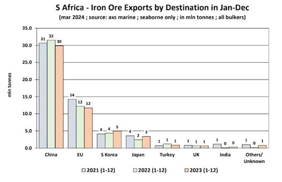 它補(bǔ)充說(shuō),南非海運(yùn)鐵礦石出口量上次增長(zhǎng)是在2020年,同比增長(zhǎng)3.8%,達(dá)到5780萬(wàn)噸。從那時(shí)起,它們就持續(xù)下降。2021年,南非鐵礦石出口量同比下降2.7%至5620萬(wàn)噸。2022年,出口量進(jìn)一步同比下降6.4%至5260萬(wàn)噸。2023年,產(chǎn)量穩(wěn)定,同比僅下降0.2%至5250萬(wàn)噸。2024年1月至2月的成交量實(shí)際上有所反彈,達(dá)到900萬(wàn)噸,同比增長(zhǎng)4.4%。南非鐵礦石出口目的地已從中國(guó)轉(zhuǎn)移。迄今為止,中國(guó)大陸仍然是南非最大的鐵礦石進(jìn)口國(guó),2023年占南非鐵礦石總出貨量的56.9%。2023年,中國(guó)從南非的鐵礦石進(jìn)口量同比下降5.2%,從31.5萬(wàn)噸下降至2,990萬(wàn)噸。2022年將達(dá)到100萬(wàn)噸。這也遠(yuǎn)低於2020年運(yùn)往中國(guó)的3940萬(wàn)噸。南非礦石的第二大目的地是歐盟,占22.3%的份額。南非對(duì)歐盟的出口量從2022年的1,220萬(wàn)噸同比下降3.9%至2023年的1,170萬(wàn)噸。另一方面2023年對(duì)韓國(guó)的出口量同比增長(zhǎng)14.5%至500萬(wàn)噸。2023 年,日本的出口量也同比增長(zhǎng)38.3%,達(dá)到340萬(wàn)噸。