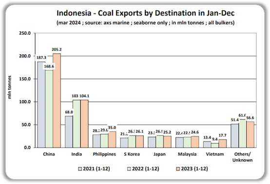 根據(jù)Banchero Costa資料,2023年,印尼55%的煤炭由巴拿馬型散貨船裝載,超靈便型/靈便型船占37%,海岬型僅占8%。中國仍然是印尼海運煤炭出口的最大進口國,占2023年出口量的41.5%。
