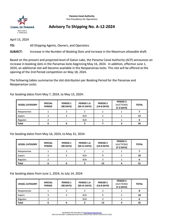與此同時,從2024年6月15日起,通過Neopanamax船閘的船舶最大吃水從目前的13.41米(44英尺)調整為13.71米(45英尺)。